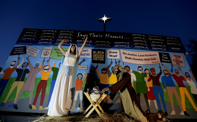The Claremont Church's Christmas outreach this year is a Nativity scene that includes the Holy Family in front of a painting of masked people holding signs reading, "Black Lives Matter" and "I can't breathe"
