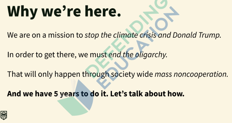 Slides from a March 2026 Sunrise Movement membership meeting, obtained by Defending Education, lay out a vision to "structurally change the foundations of this country" in pursuit of "eco-socialism" and a "multi-racial democracy."