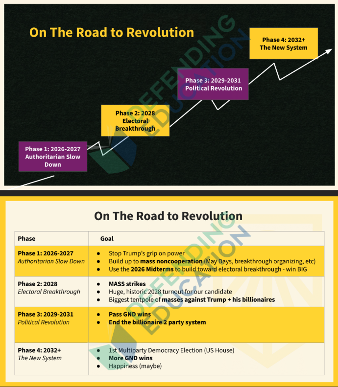 - Phase 1 includes: "Stop Trump’s grip on power," "build up to mass noncooperation" with protests like May Day, and use the 2026 midterms to build toward an electoral breakthrough — win big."
